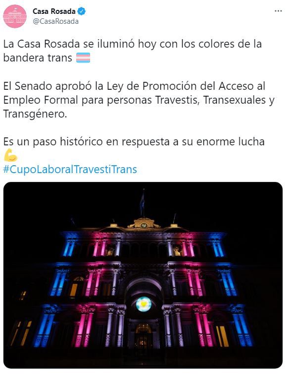 De igual modo se expresó la vicepresidenta Cristina Kirchner: “Hoy el Senado convirtió en ley el cupo laboral travesti trans. Esta ley es el resultado de una lucha muy larga y todavía queda mucho por avanzar. Siempre por más derechos y más igualdad”.