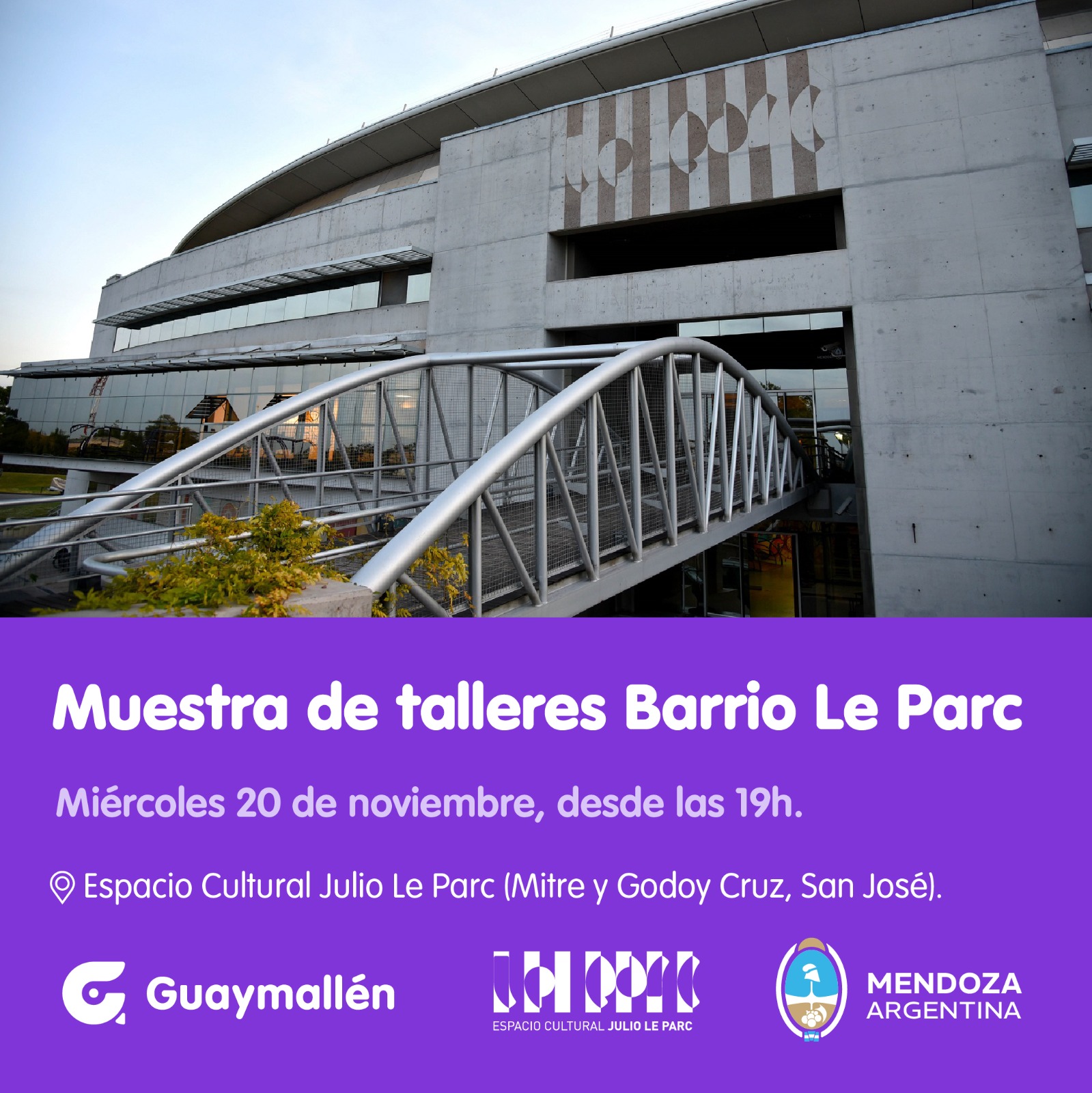 El miércoles 20 de noviembre, a partir de las 19h, se realizará una muestra de talleres que son parte del Programa social y cultural Barrio Le Parc, coordinados por la Municipalidad de Guaymallén y la Subsecretaría de Cultura de Mendoza. El encuentro será en el Espacio Cultural Julio Le Parc (Mitre y Godoy Cruz de San José), con entrada gratuita y abierto al público en general.