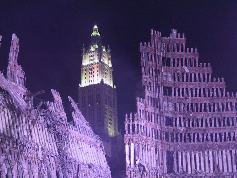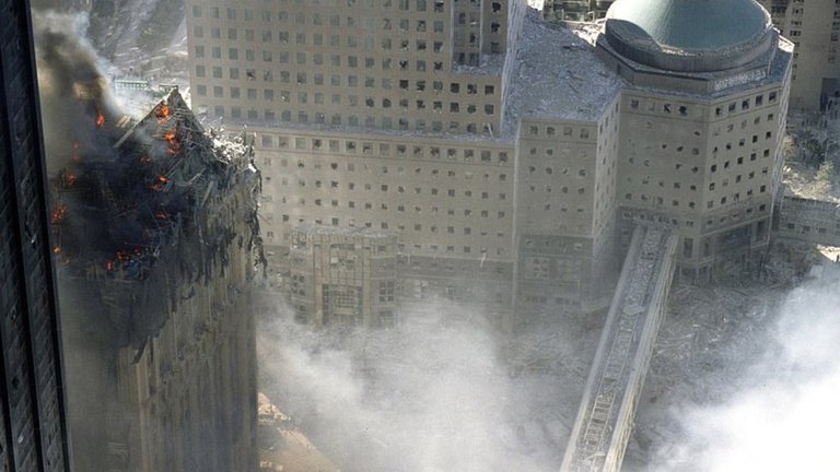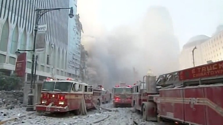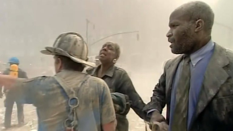Un mar opresivo de polvo blanco cubrió las calles, los edificios y la atmósfera de World Trade Center. Los heridos pedían agua y tosían a grandes arcadas por las partículas inhaladas, los guardias de seguridad registraban cada planta de los distintos rascacielos, y los equipos de emergencia trabajan a contrarreloj para localizar posibles víctimas atrapadas bajo los escombros. De fondo, el sonido perturbador e insistente de las alarmas agudizaba el nerviosismo.