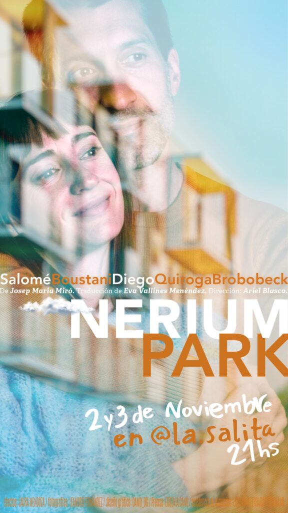 Nerium Park. Dramaturgia: Josep María Miró. Traducción: Eva Vallines Menéndez. Dirección: Ariel Blasco. Actúan: Salomé Boustani y Diego Quiroga Brobobeck. Asistencia de Dirección: Estefanía Ferraro Pettignano. Efectos: Laura Mendoza. Fotografía: Leandro Fernández. Diseño Gráfico: DAMO_dg. Prensa: Eugenia Cano.