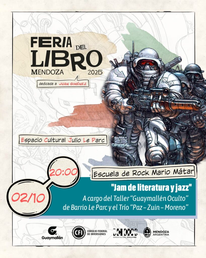 En segundo lugar el jueves 2 de octubre a las 20 horas en la Escuela de Rock Mario Mátar (ubicada en el estacionamiento del Espacio Cultural Julio Le Parc) habrá un «Jam de literatura y jazz» a cargo del taller «Guaymallén Oculto» de Barrio Le Parc y el «Trío Paz – Zuin – Moreno».