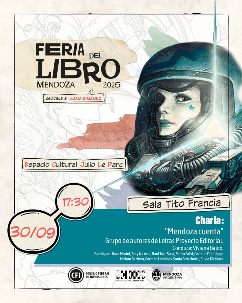 En primer lugar el martes 30, en la sala Tito Francia a las 17:30 horas se realizará la charla sobre el libro Mendoza Cuenta de Letras Proyecto Editorial, el mismo es un libro donde escritores mendocinos cuentan a través de relatos, cuentos y poesía historias de la provincia que llevan bien guardadas en su corazón.