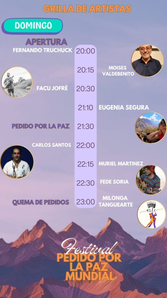El sábado 4 y el domingo 5 de enero, a las 20, se llevará a cabo el “3er Festival Internacional Pedido por la Paz Mundial» en el centro Cultural de Uspallata.