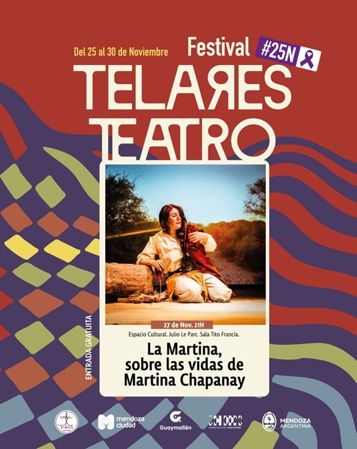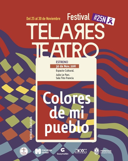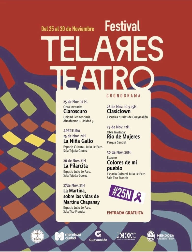 En el marco del Día Internacional de la Eliminación de la Violencia contra la Mujer llega: Festival Telares Teatro #25N porque hay historias que se tejen con arte, territorio y comunidad. Y nos invitan a ser parte de una de ellas: Del 25 al 30 de noviembre una semana de obras, charlas y encuentros en distintos espacios de Mendoza con la temática de ser mujer principalmente.