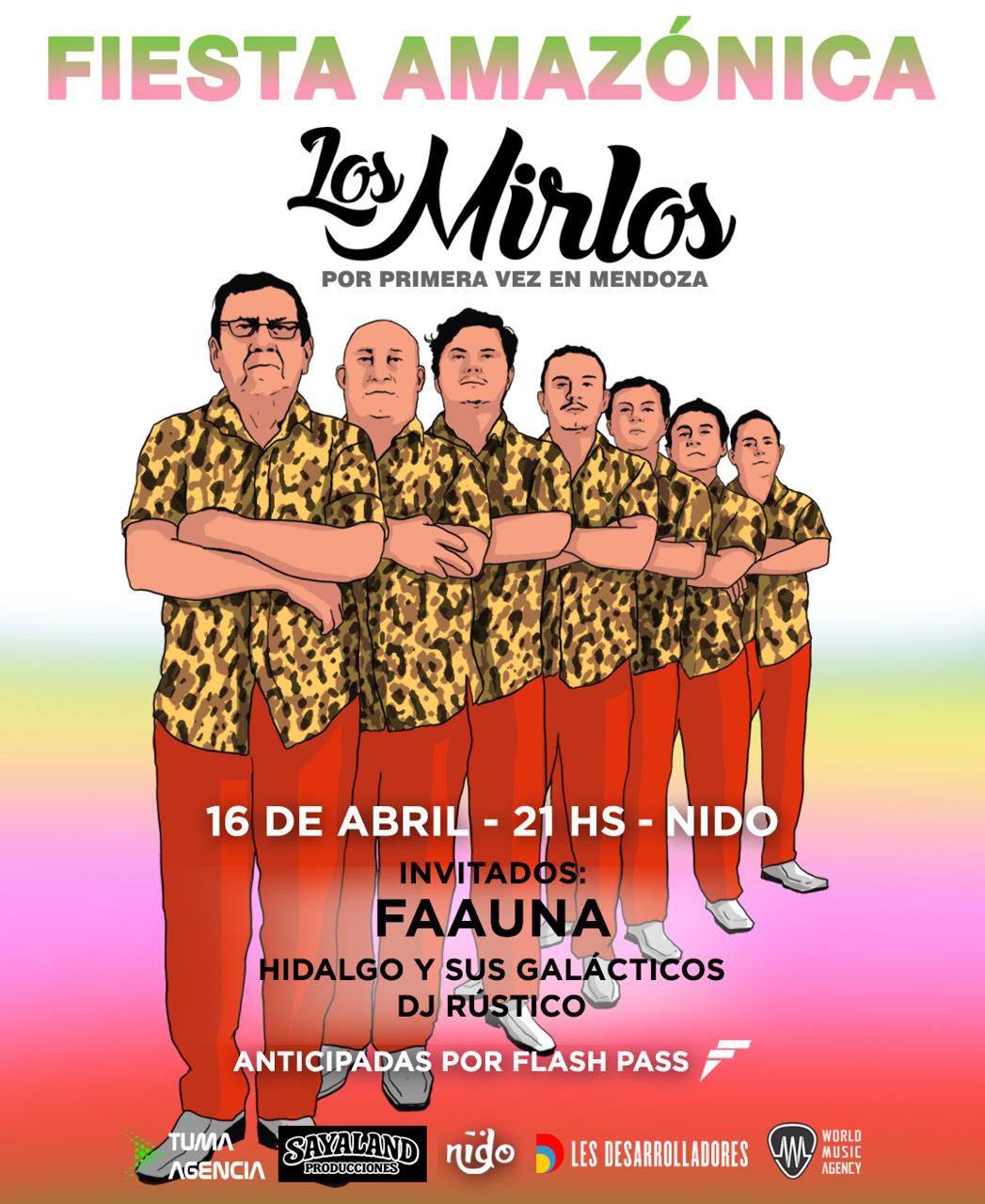 La histórica agrupación peruana Los Mirlos (losmirlos), considerada pionera de la cumbia amazónica psicodélica, se presentará por primera vez en Mendoza el jueves 16 de abril a las 21 horas en Nido Club (Mitre esquina Godoy Cruz, Ciudad). La noche se vivirá como una auténtica Fiesta Amazónica, con invitados especiales como Faauna y Hidalgo y sus Galácticos, además de la musicalización de DJ Rüstico. Las entradas anticipadas ya se encuentran disponibles a través de Flashpass.com.ar , con capacidad limitada.