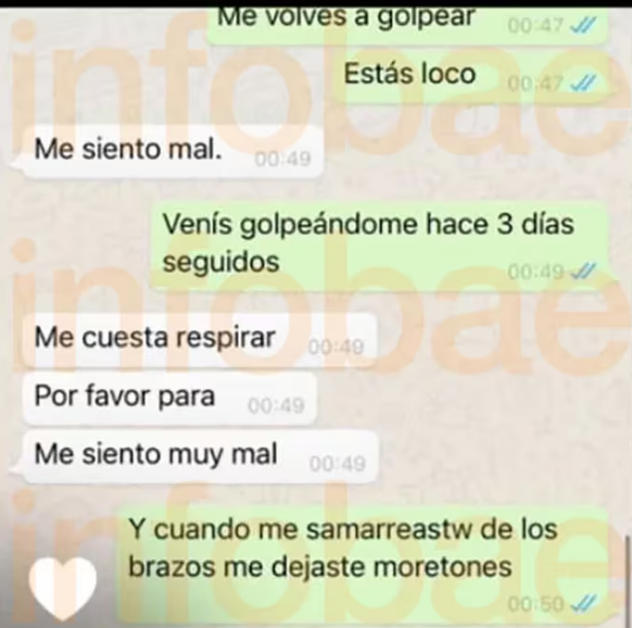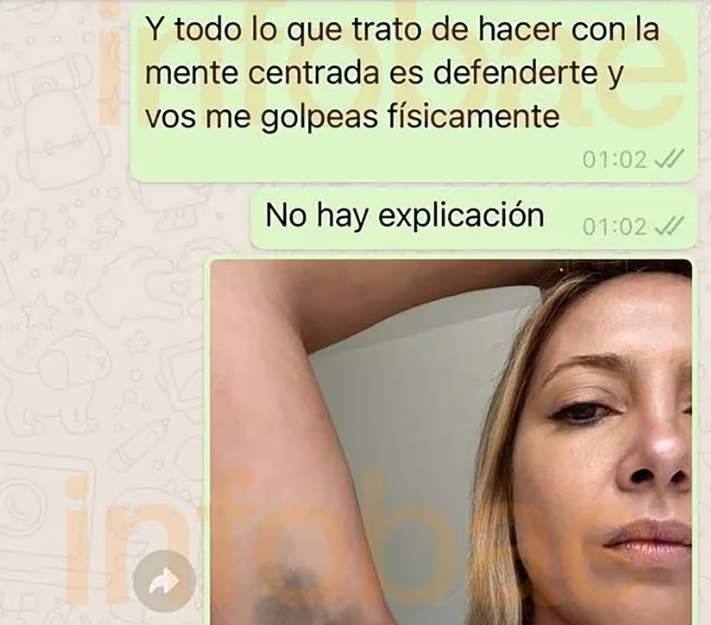 En las imágenes se puede ver a la ex primera dama con moretones en el brazo y la cara. Son fotos que ella le manda al ex mandatario reprochándole su actitud violenta: “Esto no funciona así todo el tiempo me golpeas. Es insólito. No puede dejar que me hagas esto cuando yo no te hice nada. Y todo lo que trato de hacer con la mente centrada es defenderte y vos me golpeas físicamente. No hay explicación”.