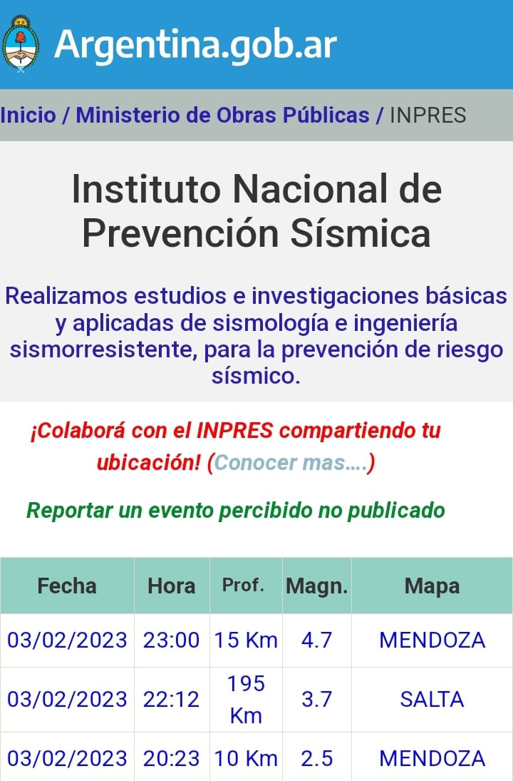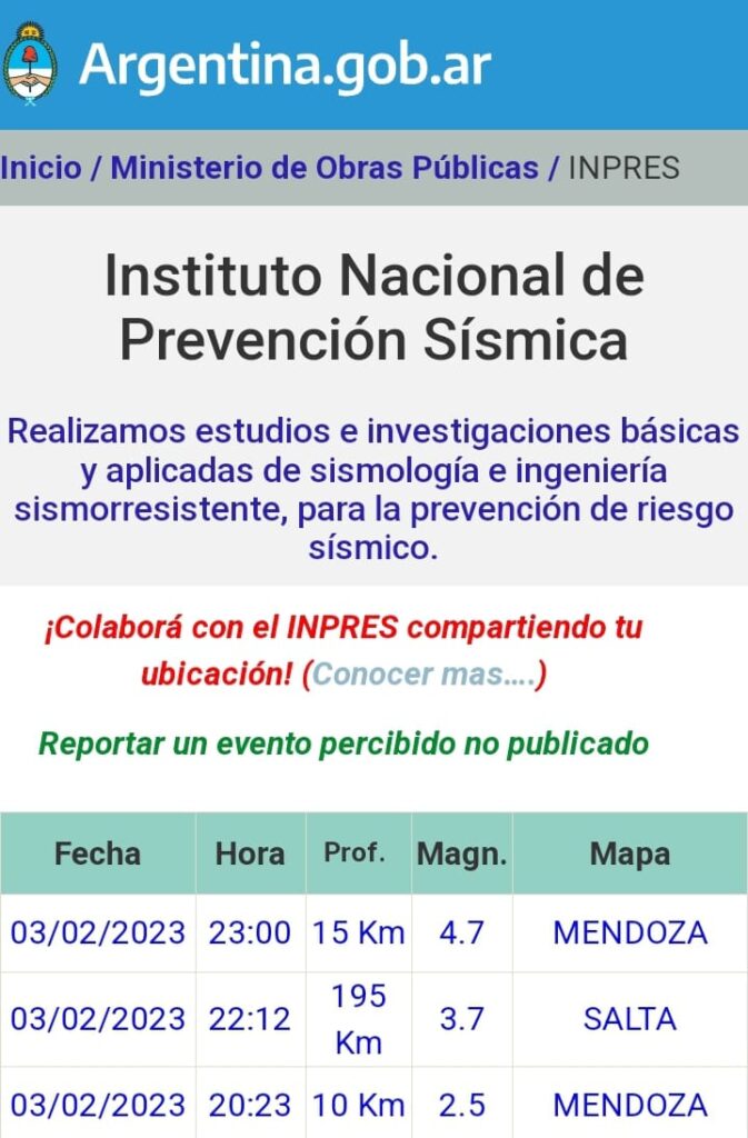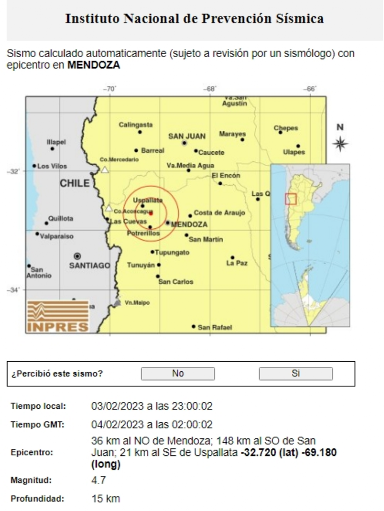 Según los datos oficiales del INPRES, el fuerte temblor fue de 4,7 grados en la escala de Richter y se registró a 36 km al noroeste de Mendoza. Se produjo a 15 kilómetros de profundidad.