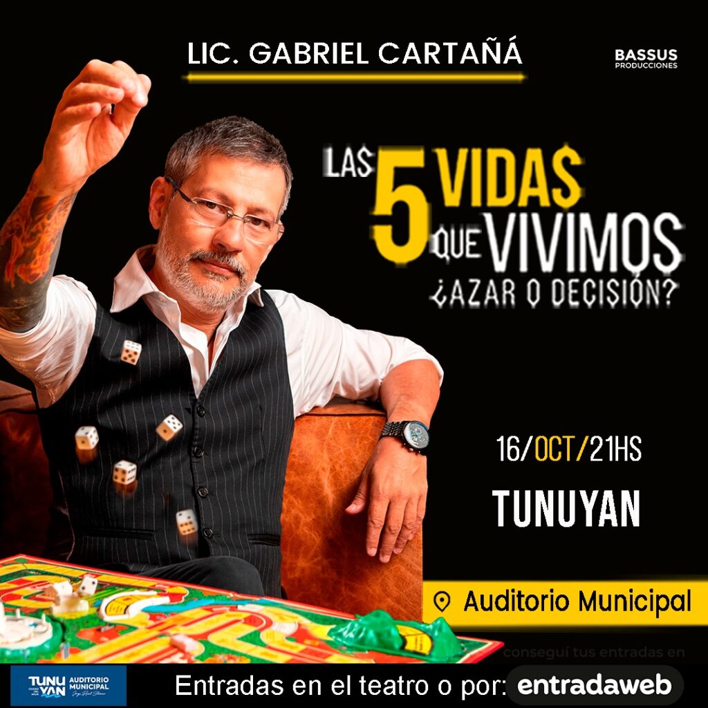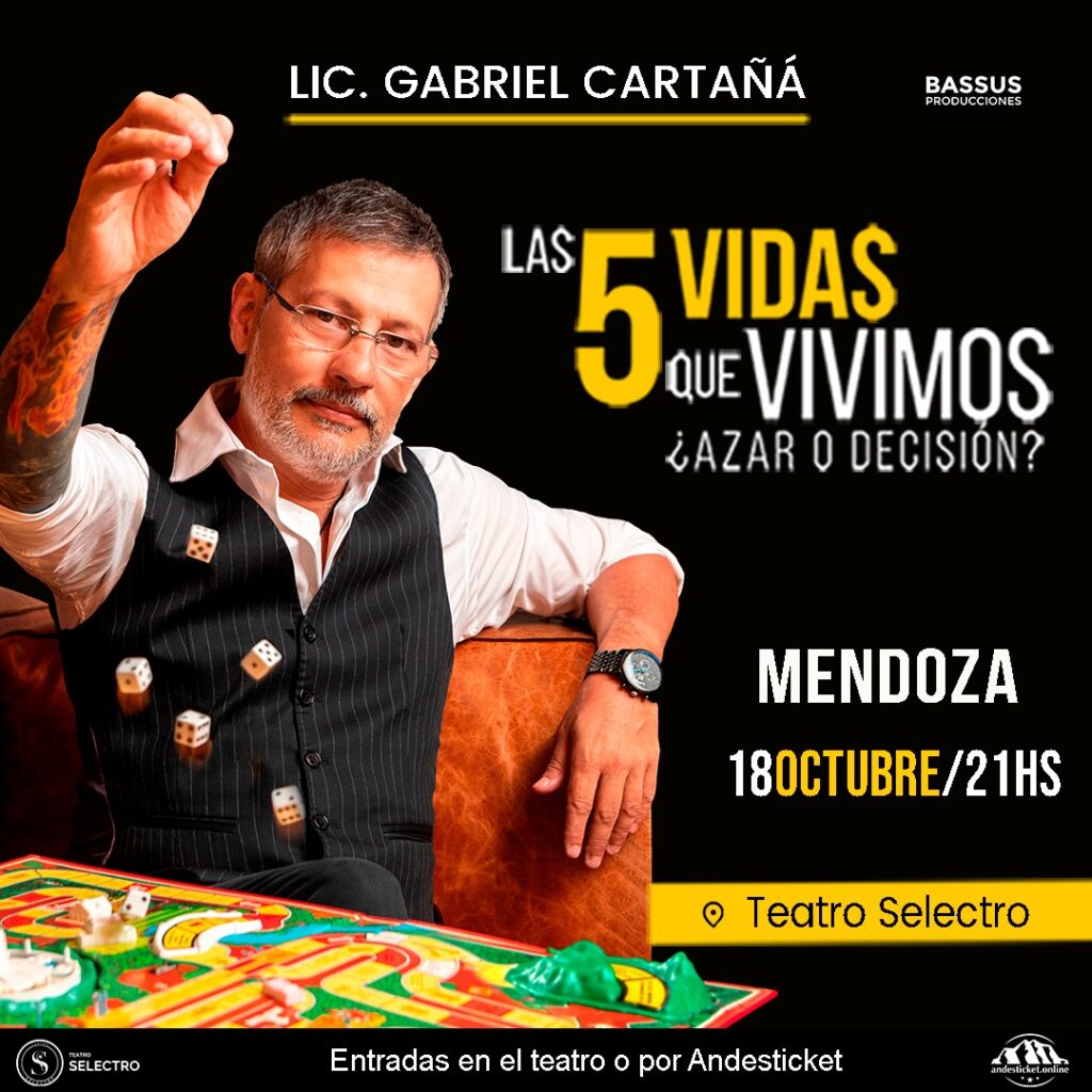 El reconocido psicólogo y escritor Gabriel Cartañá (cartanagabriel) llega a Mendoza con su espectáculo «Las 5 vidas que vivimos«: ¿azar o decisión?, un unipersonal que propone analizar la vida y reflexionar acerca de los múltiples caminos que tomamos a lo largo de nuestra existencia. El encuentro es el próximo 18 de octubre en el Teatro Selectro, las entradas ya se encuentran disponibles en AndesTicket