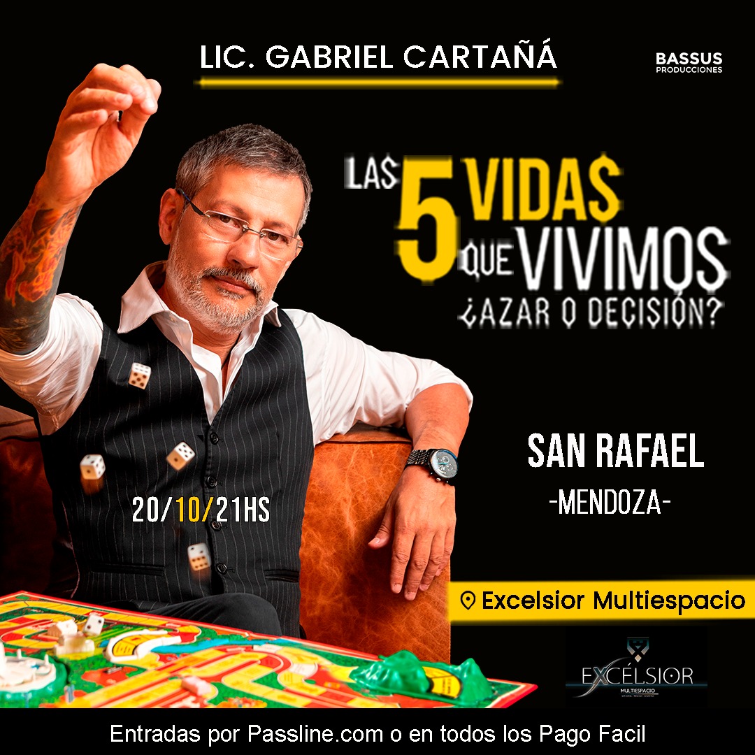 El reconocido psicólogo y escritor Gabriel Cartañá (cartanagabriel) llega a Mendoza con su espectáculo «Las 5 vidas que vivimos«: ¿azar o decisión?, un unipersonal que propone analizar la vida y reflexionar acerca de los múltiples caminos que tomamos a lo largo de nuestra existencia. El encuentro es el próximo 18 de octubre en el Teatro Selectro, las entradas ya se encuentran disponibles en AndesTicket