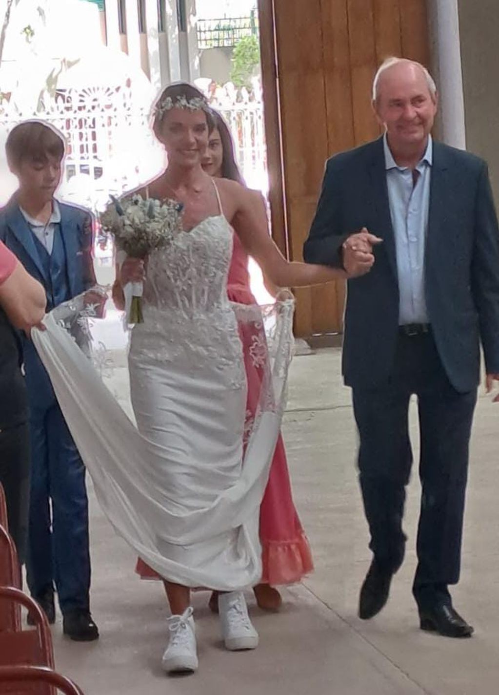 Luego, acompañada de su padre, la joven entró a la iglesia vestida de blanco con una tiara a juego que estaba revestida de delicadas flores blancas. Con zapatillas a tono del vestido, la reina deslumbró con su belleza sobre la alfombra roja.