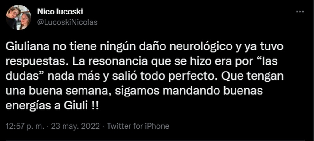 Nicolás Lucoski, quien suele compartir novedades sobre la salud de su hermana en Twitter, confirmó el domingo pasado -día en que se cumplieron dos semanas del accidente- que a Giuliana le habían retirado el respirador por momentos y seguía evidenciando mejoras en su estado. “Giuli se encuentra sin respirador, tiene los pulmones impecables. Sigue estable. Cada vez falta menos para tenerla con nosotros, Buen domingo!!”, tuiteó el joven.