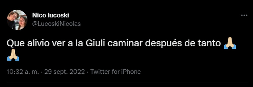 “Que alivio ver a la Giuli caminar después de tanto”, escribió cerca de las 10:30 de hoy el hermano de Giuliana en Twitter, y acompañó el mensaje con dos emojis de manitos chocando entre sí. La publicación no tardó en sumar “Me gusta” y “Retuits”, además de incontables mensajes de usuarios que se emocionaron y alegraron con la novedad.