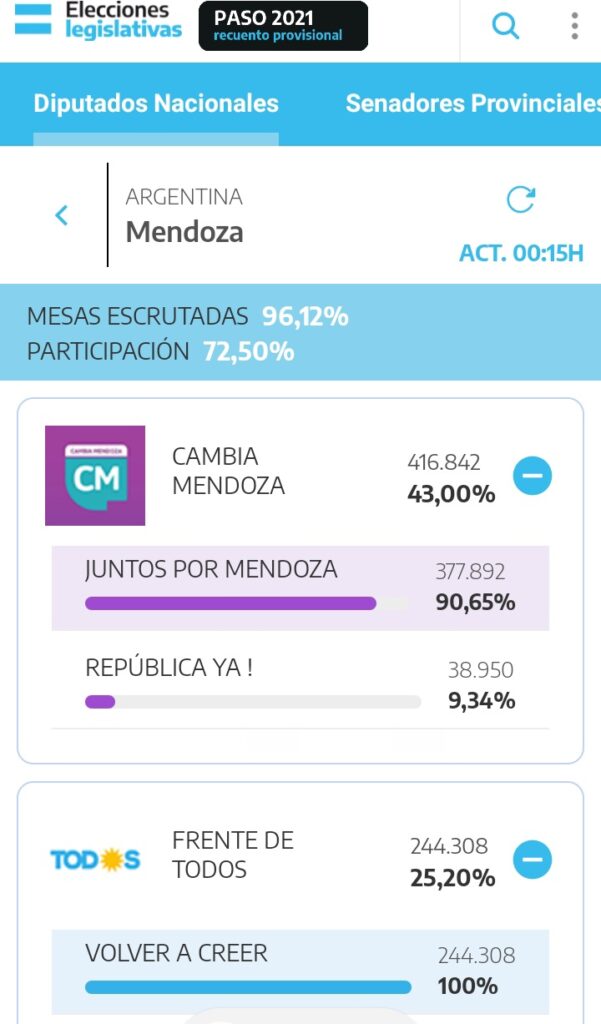 Sin embargo, según los datos oficiales, en San Rafael con el 85,15% de las mesas escrutadas, el triunfo de Cambia Mendoza en senadores es con el 37,06%, por sobre el 30,94% del Frente de Todos.