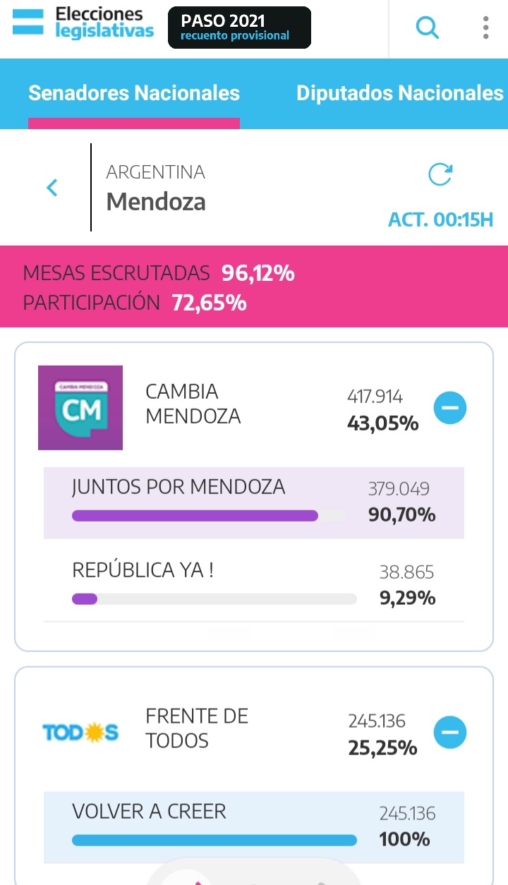 Sin embargo, según los datos oficiales, en San Rafael con el 85,15% de las mesas escrutadas, el triunfo de Cambia Mendoza en senadores es con el 37,06%, por sobre el 30,94% del Frente de Todos.