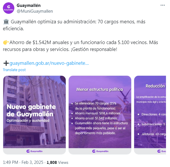 Desde la comuna aseguraron que se trata de una reducción del 25% en cargos jerárquicos en la Municipalidad de Guaymallén. De esta manera, el equipo del Calvente pasó de 280 a 210 cargos fuera de escalafón.
