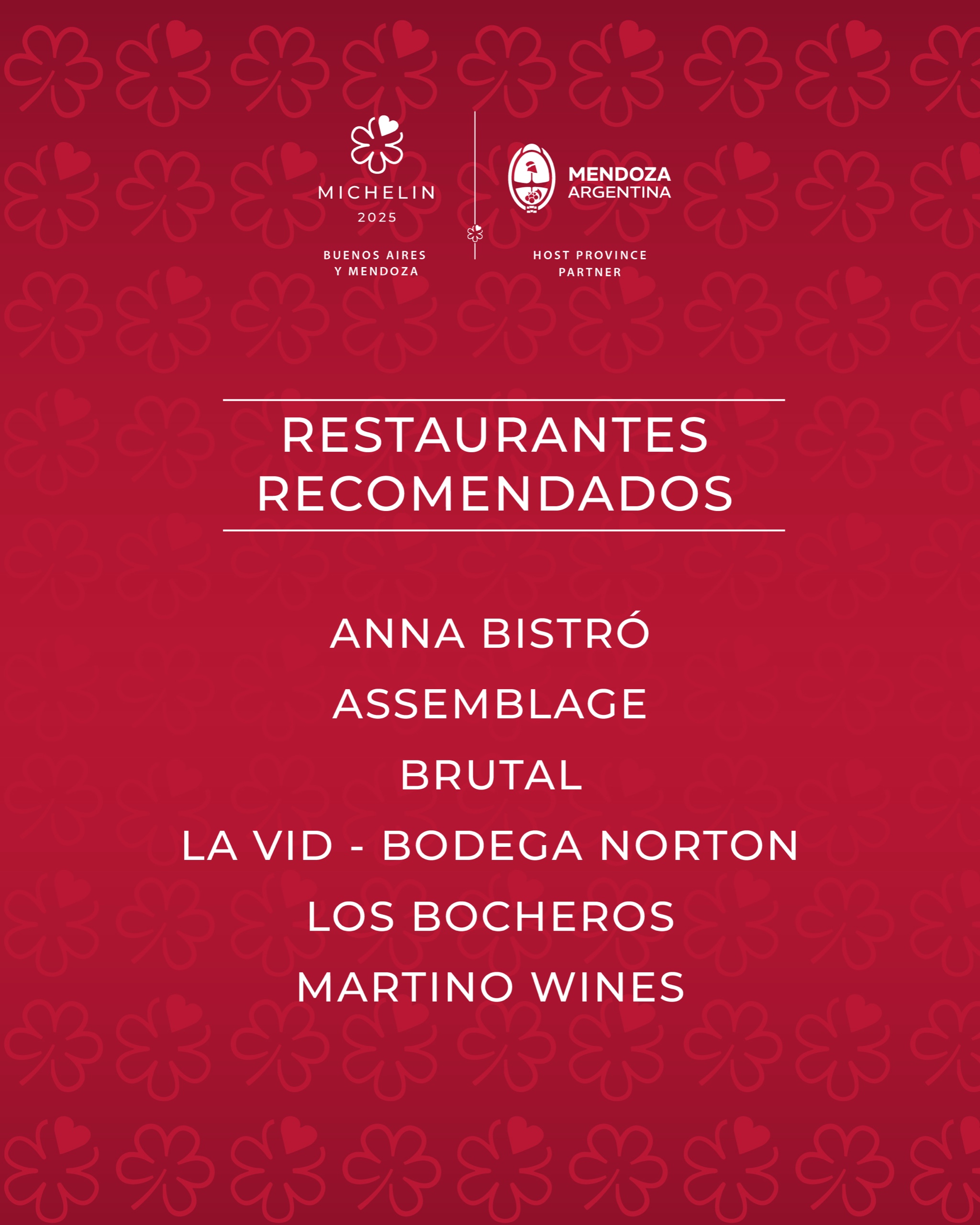 - Los restaurantes mendocinos que entraron a los recomendados de la Guía Michelin en 2025: Ana Bristó, Alejandro Gallinski; Assemblage, Mauro Porfilli; Brutal, Eugenia Adriazola; La vid, Bodega Norton, Facundo Di Fabricio; Los Brocheros, Lucas Olcese; Martino Wines, Javier Quinteros.