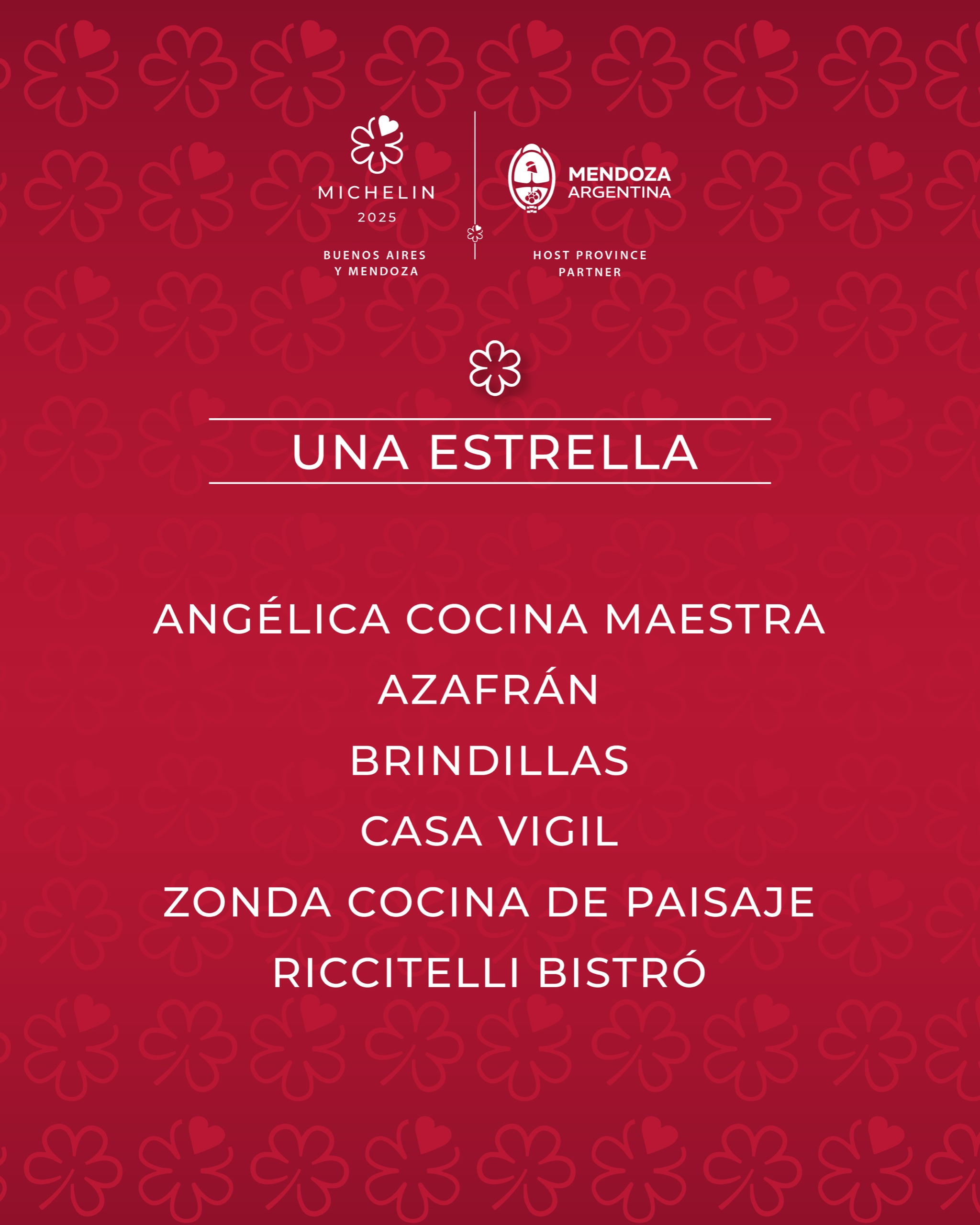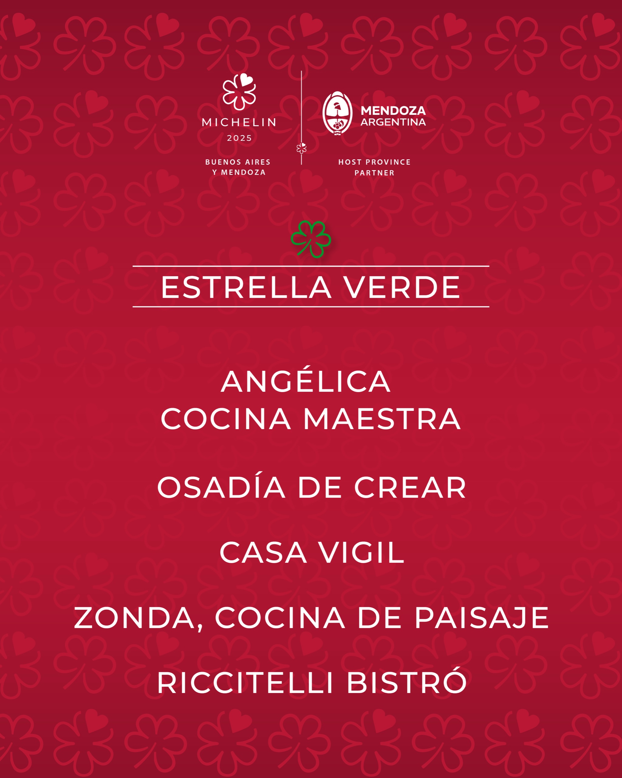 - Estrella Michelin: Angélica Cocina Maestra – Josefina Diana & Juan Manuel Feijoo (Mendoza); Crizia – Gabriel Oggero (Buenos Aires); Riccitelli Bistró – Juan Ventureyra (Mendoza).