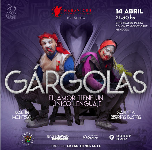 Al igual que el teatro, el amor tiene un lenguaje universal. Tanto en Japón, Estados Unidos, Brasil o Argentina una caricia, un beso o un abrazo significan lo mismo. Por esto, para celebrar sus 20 años, la compañía de teatro popular Haravicus eligió Gárgolas, una obra que habla sobre este sentimiento común a todos los seres humanos. Es una coproducción internacional con el prestigioso director brasilero Breno Moroni y se presentará el viernes 14 de abril, a las 21:30, en el Cine Teatro Plaza.