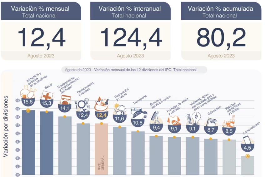 El Índice de Precios al Consumidor (IPC) aumentó 12,4% en agosto respecto de julio y un 124,4% en la medición interanual, con lo que acumula un alza de 80,2% en los primeros ocho meses del año, informó el Instituto Nacional de Estadísticas y Censos (Indec).