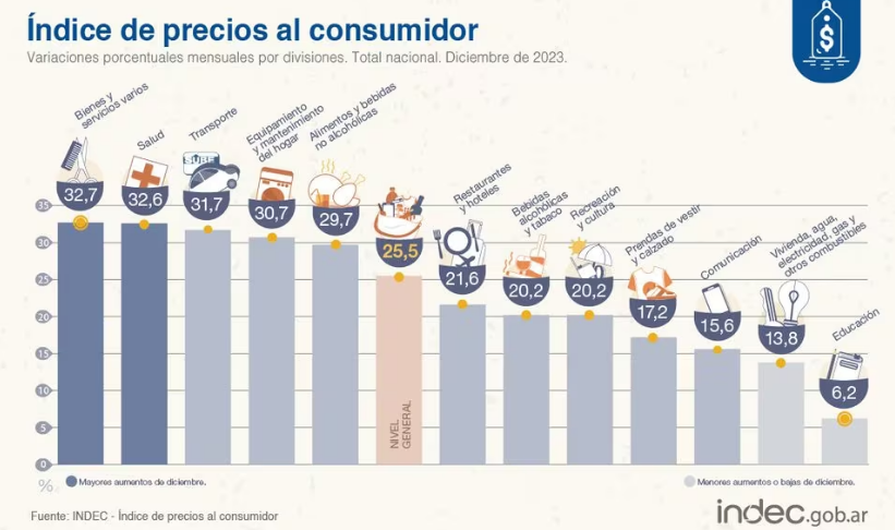 Se conoció esta tarde el primer dato sobre inflación en la gestión de Javier Milei. Según el Indec, la inflación de diciembre se ubicó en el 25.5% y el 2023 cerró con un incremento en los precios del 211,4%