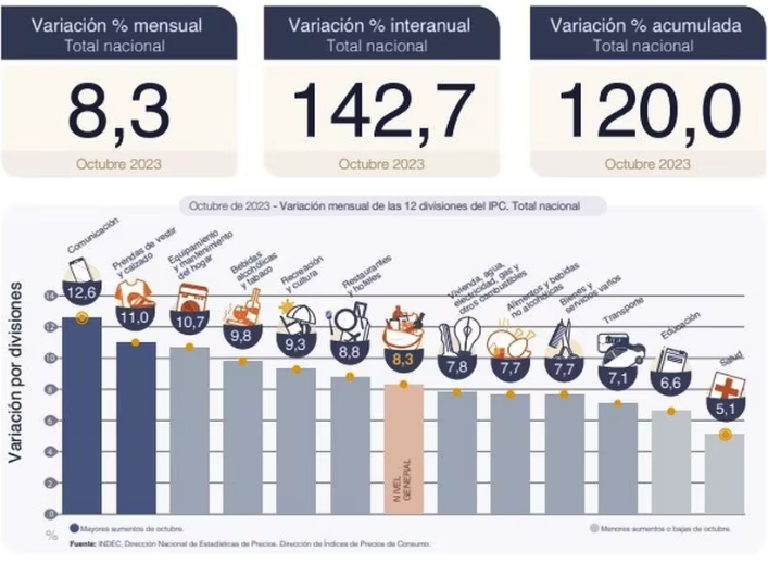 Según la información suministrada por la DEIE, el aumento en el costo de vida se ubicó en octubre en el 7,9%, lo que implica una suba acumulada durante el 2023 de 121,8% y al compararlo con octubre de 2022, el incremento trepa al 144,2%.