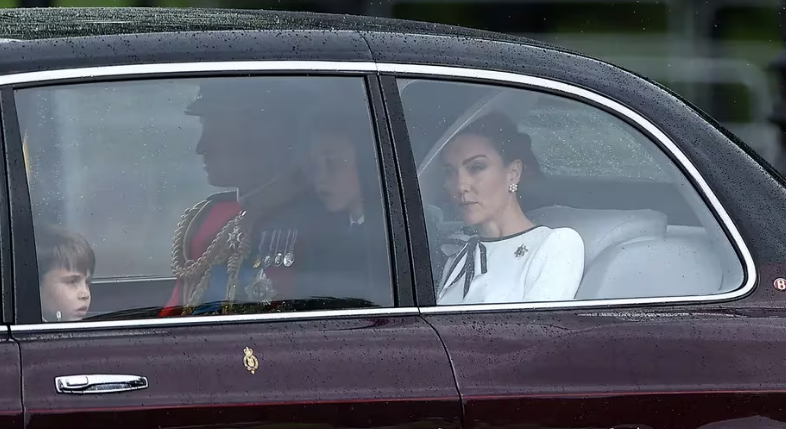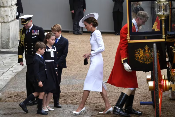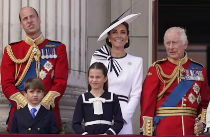 Kate cumplió con un ritual, donde se mide la importancia de cada miembro de la Familia Real. Apareció en el balcón del palacio, con William, su marido y heredero; George, que recibirá el trono de su padre; Charlotte y Louis, sus hijos. Al lado el rey Charles y reina Camilla, los duques de Edimburgo y el duque de Gloucester y de Kent.