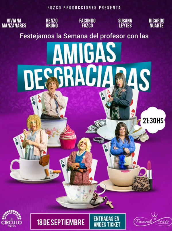 A pedido del público el elenco El Globo (comedia.mendoza)vuelve a escena con “Amigas desgraciadas”. La obra dirigida por Facundo Fozco, y protagonizada por un elenco estelar compuesto por Viviana Manzanares, Renzo Bruno, Susana Leytes, Ricardo Nuarte y el mismo Fozco, se podrá disfrutar el jueves 18 de septiembre en el Teatro El Círculo. Entrada general: $10.000. Por Andes Ticket o en boletería el día de la función. Descuento para jubilados adquiriendo la entrada en taquilla.