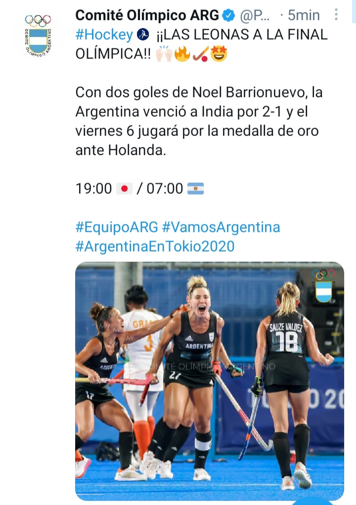 Las Leonas son finalistas olímpicas por tercera vez en su historia. El seleccionado argentino femenino de hockey sobre césped venció 2-1 a India y jugará la definición de los Juegos Olímpicos de Tokio 2020. De esta manera, Argentina se asegura una nueva medalla olímpica, al menos la de plata.