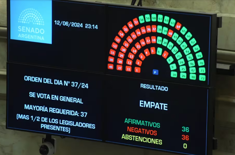 El Senado aprobó este miércoles la Ley Bases y pasa a revisión en Diputados. Con los números justos para el quórum, la sesión arrancó pasadas las 10 de este miércoles y después de las 23 la votación arrojó un empate en 36 votos. Frente a esta igualdad desempató la presidenta del Senado y vicepresidenta de la Nación, Victoria Villarruel.