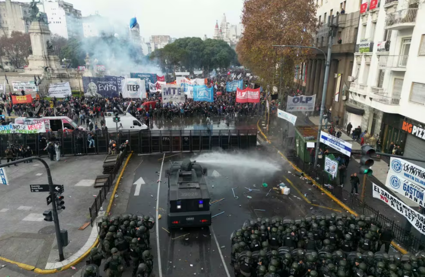 La policía disparó balas de goma, gas pimienta y utiliza los camiones hidrantes para dispersar a los activistas que atacaron el vallado colocado para delimitar la marcha que tiene como objetivo presionar a los senadores para no apoyar la Ley Bases.