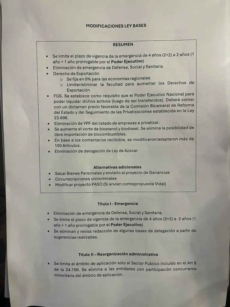 Aunque aún falta pulir la letra chica, Francos le comunicó a los jefes de los bloques del PRO, Cristian Ritondo; de la UCR, Rodrigo De Loredo; de Hacemos Coalición Federal, Miguel Pichetto; y de Innovación Federal, Pamela Calletti, que están dispuestos a cambiar los artículos sobre facultades delegadas, privatizaciones, retenciones y jubilaciones, y retirar parte de la reforma electoral.