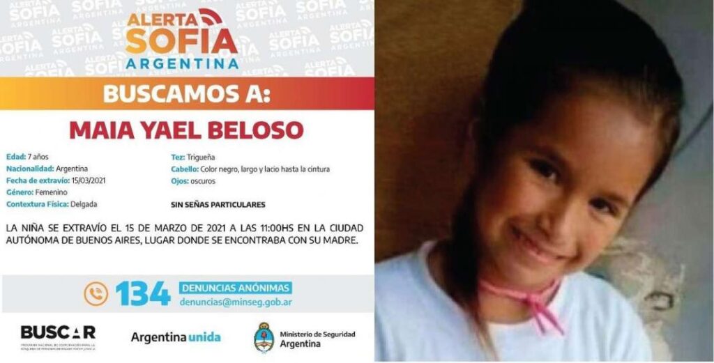 La jueza Fabiana Galletti, a cargo del Juzgado Nacional en lo Criminal y Correccional Nº 57, ordenó este miércoles la captura y detención de Carlos Alberto Sierra (o Savanz), el sospechoso de haber secuestrado a Maia Yael Beloso, la niña de 7 años buscada desde este lunes, cuando se fue junto a un hombre que su madre había conocido hacía pocas semanas. Ambas estaban en situación de calle en el barrio porteño de Parque Avellaneda. El hombre buscado, visto por última vez en el partido de Ituzaingó, en la provincia de Buenos Aires, mide un metro setenta y tiene 39 años de edad.