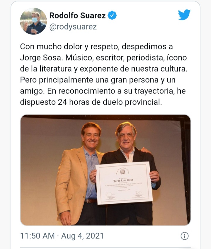 En un tuit, el mandatario provincial publicó una foto con Sosa y un texto en el que, además de lamentar el fallecimiento, anunció que se decretaban 24 horas de duelo provincial.