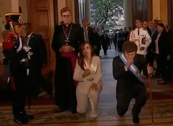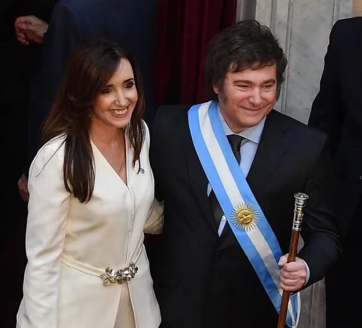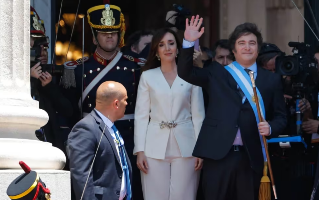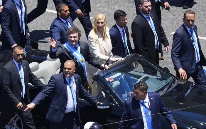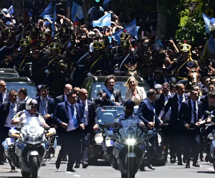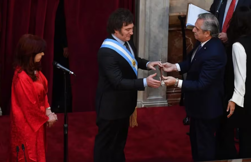 El domingo 10 de diciembre de 2023 a las 11:39 de la mañana Javier Milei se trasladó al Congreso de la Nación para convertirse en el próximo presidente. Fue recibido en las escalinatas por la vicepresidenta Victoria Villarruel y dentro del edificio por la vicepresidenta saliente, Cristina Kirchner. El nuevo mandatario abrazó a su compañera de fórmula y le dio un apretón de manos a la ex presidenta. Los tres, escoltados por los granaderos, la guardia de honor presidencial, caminaron por la alfombra roja, saludaron a las autoridades de ambas cámaras, a los miembros de la Comisión de Exterior, integrada por diputados y diputadas nacionales en el atrio del palacio legislativo. Prosiguió por el salón de las provincias para ser saludado por los miembros de la Comisión del Interior, compuesta por senadores y senadoras nacionales, diputados y diputadas nacionales de todas las fuerzas.