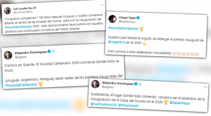 “Creímos en Grande. El Mundial Centenario 2030 comienza donde todo se inició. ¡Uruguay, Argentina y Paraguay serán sedes de los partidos inaugurales del Mundial Centenario”, había escrito minutos antes en sus redes sociales Domínguez y de inmediato creó una ola de repercusiones a nivel mundial.
