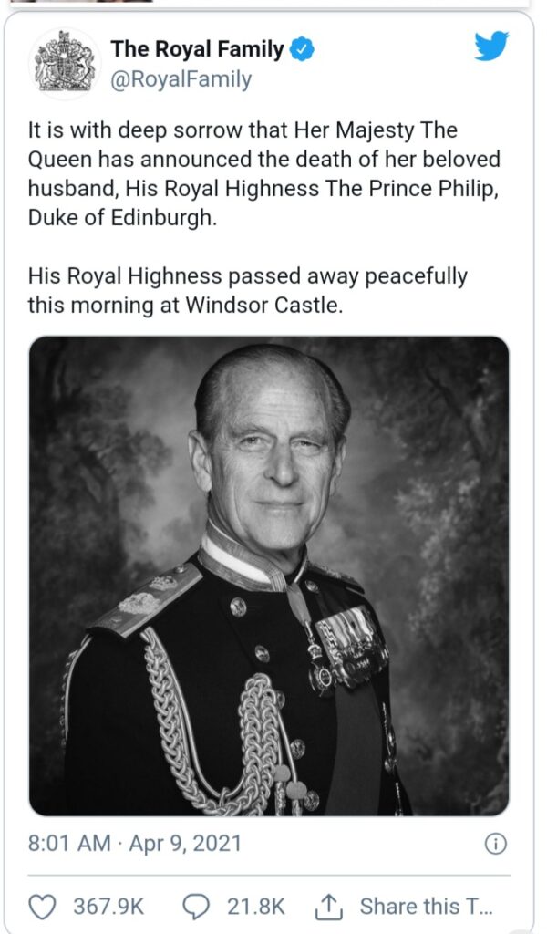 «El príncipe Felipe, esposo de la reina británica Isabel II, murió a los 99 años», dijo el Palacio de Buckingham. «Es con profundo pesar que Su Majestad la Reina anuncia la muerte de su amado esposo, Su Alteza Real el Príncipe Felipe, Duque de Edimburgo», informó el palacio a través de su cuenta de Twitter oficial.