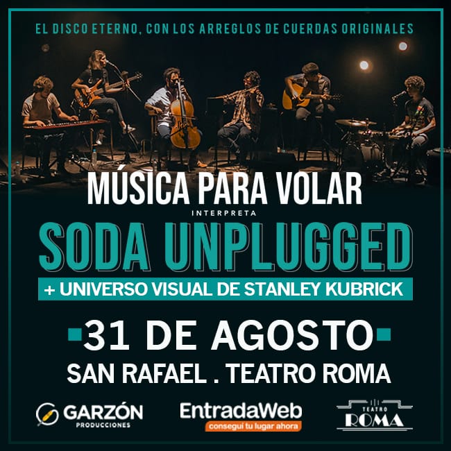 Por primera vez el aclamado grupo de Música Para Volar (mpvolar), llega al Teatro Roma (teatroromasr) con su brillante interpretación «Música para Volar + Kubrick», en el cual interpretarán en forma íntegra el disco Unplugged de Soda Stereo, con los arreglos de cuerdas originales y una puesta que combina los momentos musicales con proyecciones sincronizadas de la filmografía de Stanley Kubrick. La cita es el próximo sábado 31 de agosto a las 21:30 hs y las entradas están disponibles en EntradaWeb.