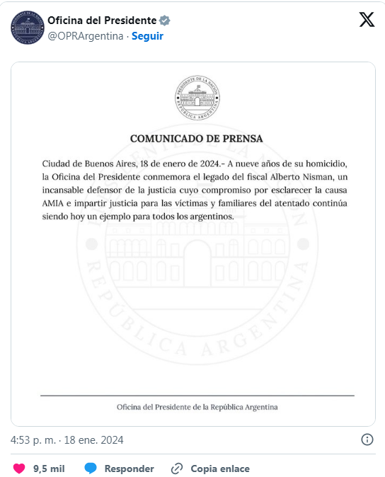 «A nueve años de su homicidio, la oficina del Presidente conmemora el legado del fiscal Alberto Nisman, un incansable defensor de la Justicia cuyo compromiso por esclarecer la causa AMIA e impartir justicia para las víctimas y familiares del atentado continúa siendo hoy un ejemplo para todos los argentinos», destaca el breve pero contundente mensaje del Gobierno de Milei.