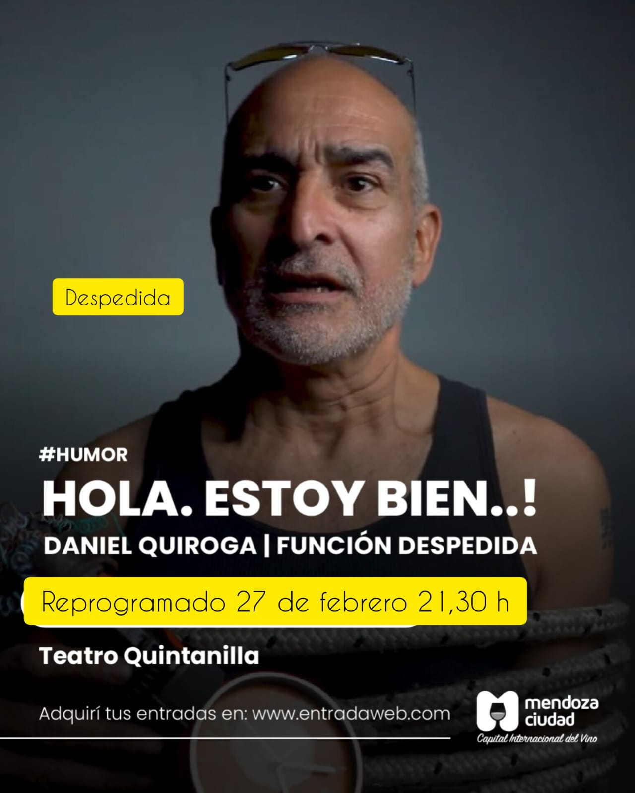 El espectáculo “Hola. Estoy bien!” llegará finalmente el 27 de febrero al Teatro Quintanilla a las 21:30 horas, tras haber sido reprogramado por las intensas lluvias del último sábado. En esta propuesta, el reconocido actor invita al público a compartir una experiencia única, donde el humor se entrelaza con la reflexión y la complicidad de la audiencia. Será una función despedida ya que el artista se ausentará varios meses de la cartelera local. Las entradas ya adquiridas tienen validez para esta presentación. También siguen localidades a la venta por EntradaWeb..