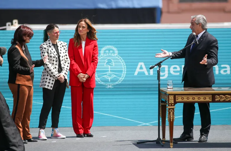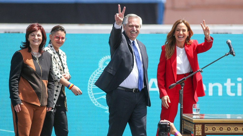 Previo a su discurso, el Presidente le tomó juramento a las nuevas ministras de Desarrollo Social, Victoria Tolosa Paz; de Trabajo, Raquel “Kelly” Kismer de Olmos; y de Mujeres, Género y Diversidad, Ayelén Mazzina, cuyos nombramientos fueron formalizados este jueves en el Boletín Oficial. En la ceremonia de toma de posesión de los cargos, Alberto Fernández agradeció a los ministros salientes Juan Zabaleta, Elizbeth Gómez Alcorta y Carlos Moroni.