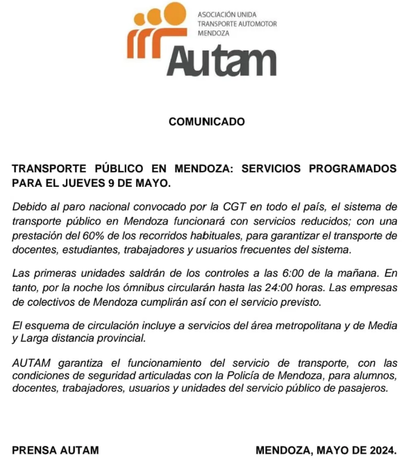 En el caso del transporte, que es muy usado por los empleados de comercio como por trabajadores en general, docentes y alumnos, funcionará al 60%; o sea que un 40% del servicio de micros se verá afectado. Los colectiveros iniciarán su jornada a las 6 de la mañana y terminarán a la medianoche, con recortes en las frecuencias habituales y dependiendo los choferes que decidan o no adherirse al paro.