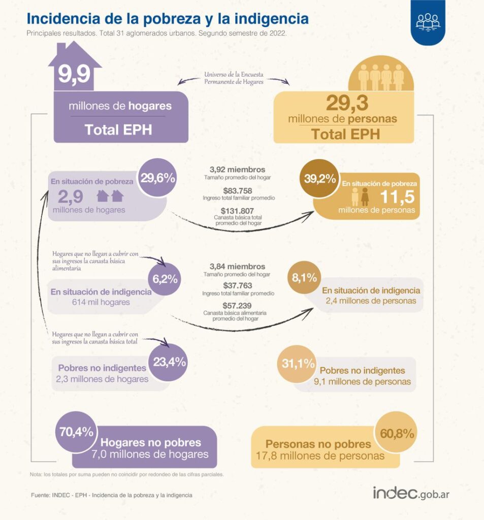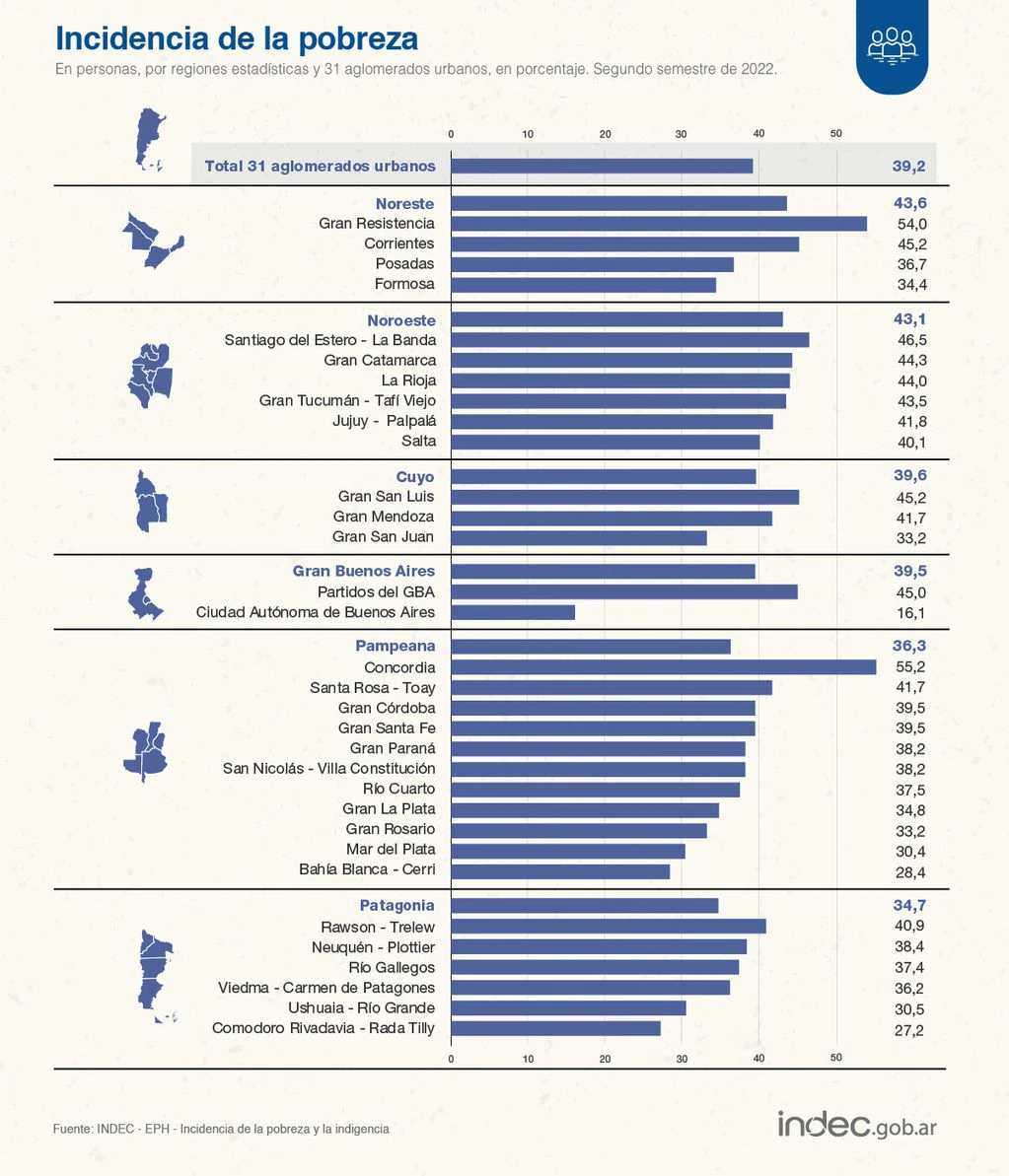 En tanto, en la región de Cuyo la pobreza se ubicó en 39,6% y la indigencia en 5,3%.