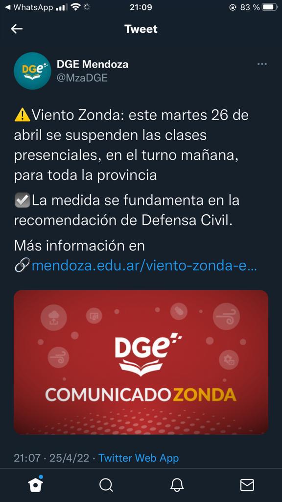 Por recomendación de Defensa Civil y la emisión del alerta naranja por condiciones de viento Zonda de importante intensidad, la Dirección General de Escuelas comunica que este martes 26 de abril queda suspendido el dictado de clases presenciales para el turno mañana en toda la provincia de Mendoza.