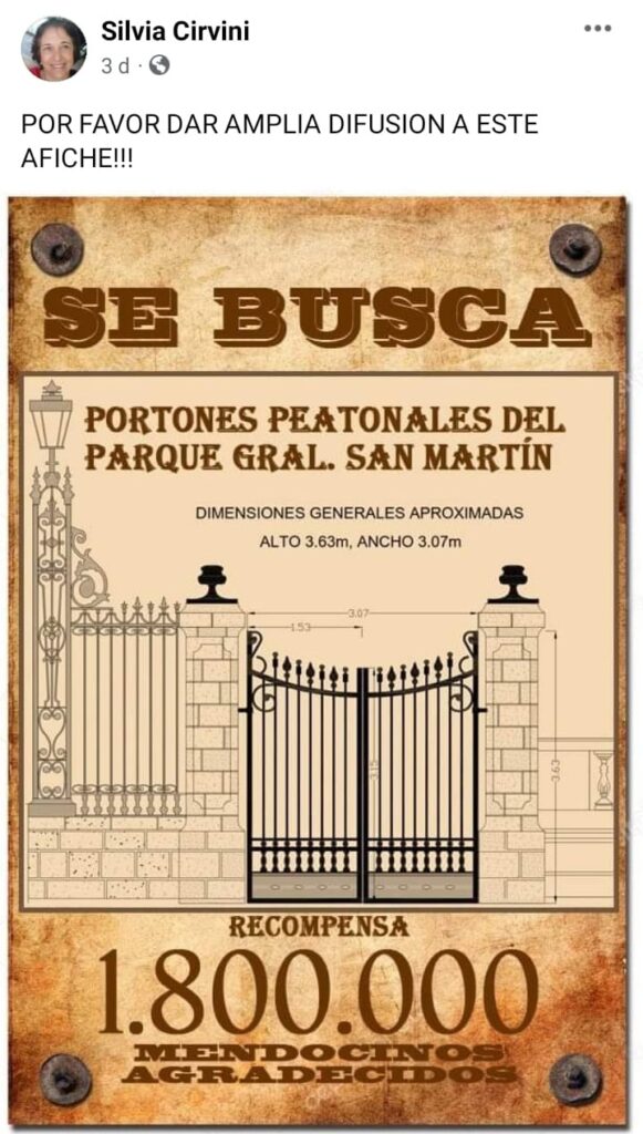Sin embargo, Cirvini no se da por vencida: quiere encontrarlos porque son parte del patrimonio de todos los mendocinos. Para esto, ha iniciado una campaña en redes sociales, que incluye una reconstrucción gráfica de los portones del parque perdidos, con sus dimensiones, ornamentos y cada uno de los detalles que harían reconocerlos al instante.