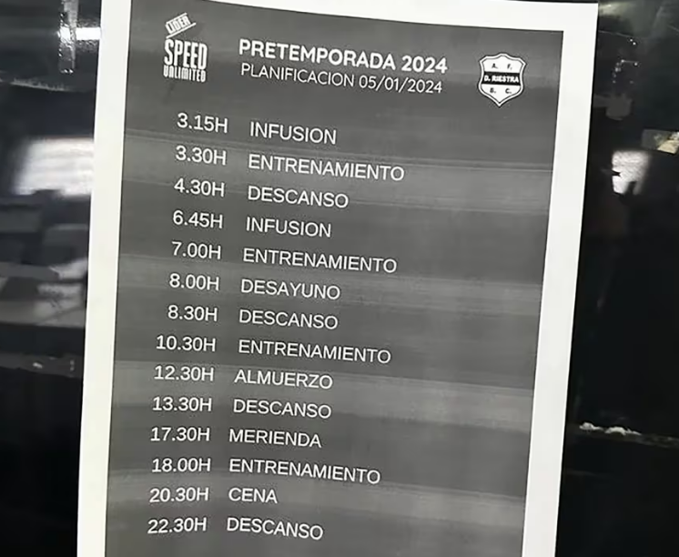 Las sesiones diarias de entrenamiento son cuatro: una a las 3:30 de la madrugada, una a las 7 de la mañana, una a las 10:30 y una a las 18 tras el almuerzo, descanso y merienda. A las 20:30 es la cena y a partir de las 22:30 los futbolistas quedan liberados para descansar. “Los resultados marcan (que sirve), hace diez años que se hace esto y al loco le dio resultado y por eso lo seguimos haciendo. El año pasado nos dio resultado y pudimos ascender. Al final los resultados se dan”, opinó Acuña sobre las bondades de este método.