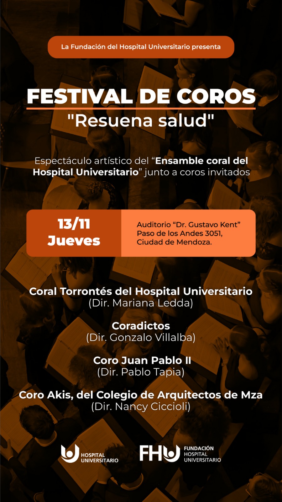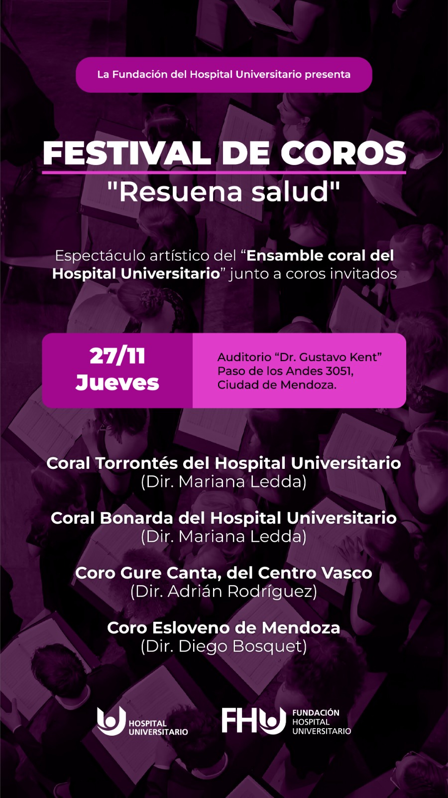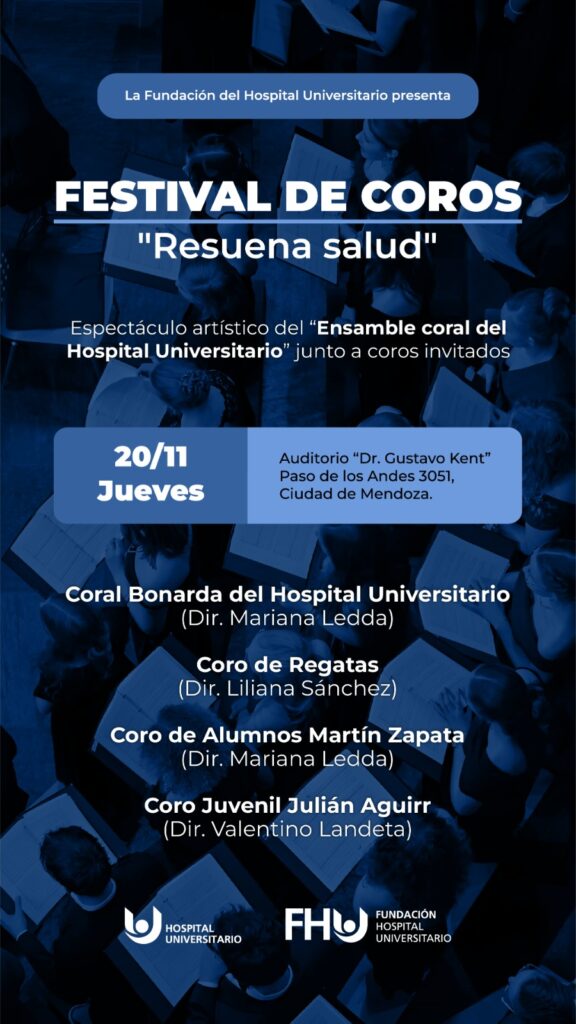El Ciclo de Coros «Resuena salud» es el primer encuentro organizado por la Fundación del Hospital Universitario (hospitaluniversitario.uncuyo) y el Ensamble Coral, recientemente creado, conformado por el Coral Torrontés y el Coral Bonarda (coral.bonarda), ambos dirigidos por la directora Mariana Ledda (@mariana_ledda).