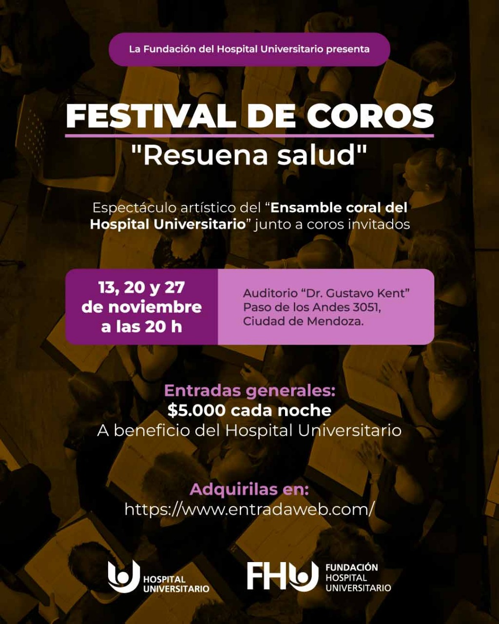 Resuena Salud es una propuesta que invita a disfrutar de la música como camino hacia el bienestar y la salud emocional. Tendrá funciones los jueves: 13, 20 y 27 de noviembre de 2025 en el Auditorio “Dr. Gustavo Kent” del Hospital Universitario en Paso de los Andes 3051 de la Ciudad de Mendoza. Se pueden conseguir las entradas por Entradaweb con un valor de $5.000 a total beneficio del Hospital Universitario y las obras que se están llevando adelante. El ingreso será por orden de llegada hasta completar el aforo total del Auditorio.