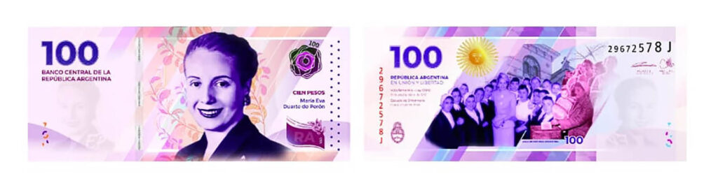 “$100. María Eva Duarte de Perón, impulsora de la Ley 13.010 de sufragio femenino de 1947 —una norma de vanguardia para la época que estableció la igualdad de derechos políticos entre hombres y mujeres—, es una figura de enorme trascendencia en la lucha por la ampliación de derechos sociales y laborales en nuestro país y un referente a nivel internacional. Se casó con Juan Domingo Perón y participó activamente en la campaña electoral que lo llevó a la presidencia de la Nación en 1946. Eva no fue una primera dama clásica y ejerció una intensa actividad política y social. Fundó el Partido Peronista Femenino y tuvo un papel determinante en la relación con los sindicatos. A través de la Fundación Eva Perón canalizó una ingente acción de ayuda social hasta su fallecimiento de forma prematura en 1952. Dejó una huella indeleble como defensora de los derechos sociales y laborales, y como ferviente promotora de medidas a favor de la igualdad de la mujer y de una mayor inclusión en beneficio de los sectores más postergados”.