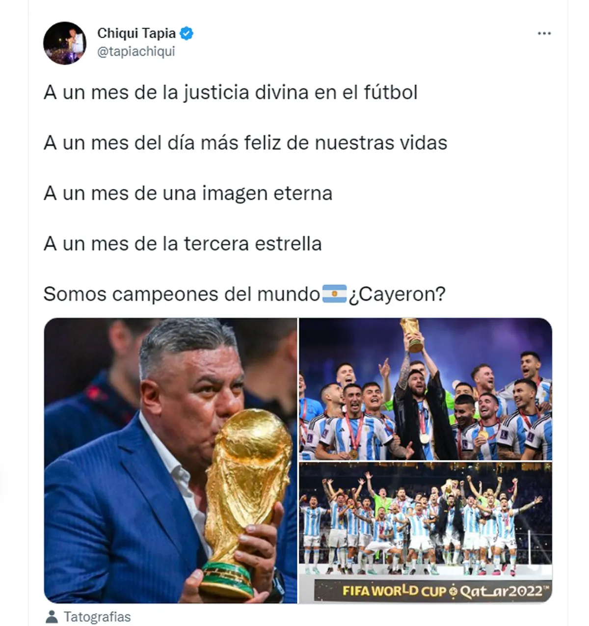 «A un mes de la justicia divina en el fútbol. A un mes del día más feliz de nuestras vidas. A un mes de una imagen eterna. A un mes de la tercera estrella. Somos campeones del mundo ¿Cayeron?», escribió, por su parte, el presidente de la AFA, Claudio «Chiqui» Tapia.