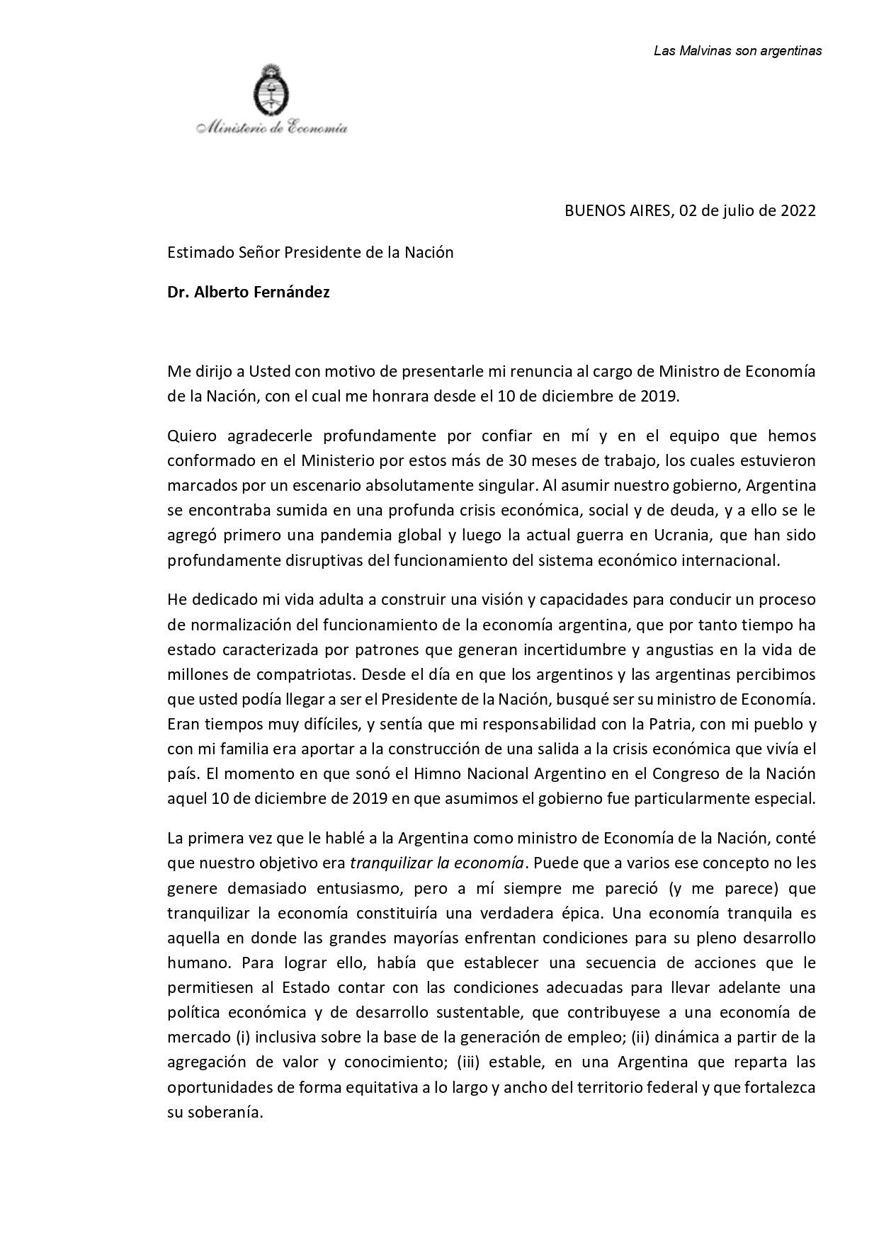 En las redes. La carta con la que Martín Guzmán presentó su renuncia al gobierno de Alberto Fernández